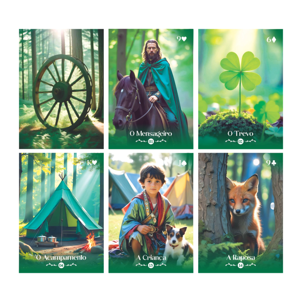 Um baralho Lenormand com 36 cartas que trazem a força, a beleza e a sabedoria da vida cigana. Cada símbolo carrega histórias, intuições e caminhos, esperando por mãos que respeitam o mistério e sabem escutar além do óbvio.